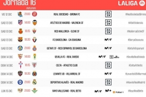 体育资讯11月13日讯 西甲联赛官方公布了本赛季第16轮联赛的比赛时间,其中巴萨主场对阵奥萨苏纳的比赛在北京时间(以下均为北京时间)12月14日01:30进行。 稍早时候,马竞将在12月13日21:00主场迎战瓦伦西亚;晚些时候,皇马将在12月15日04:00客场挑战阿拉维斯。