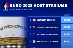 体育资讯11月13日讯 2028年欧洲杯承办球场公布,德国转会市场列出了各球场容量排名。 2028年欧洲杯球场容量排名: 温布利球场——86000 威尔士国家体育场——75923 热刺球场——60000 伊蒂哈德球场——58000 汉普顿公园球场——51000 埃弗顿球场——50000 圣詹姆斯公园球场——50000 都柏林球场——50000 维拉公园球场——48000