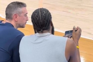 全靠你了登哥!哈登赛前和助教在一起认真研究比赛录像