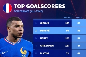 体育资讯11月14日讯 世预赛欧洲区比赛,姆巴佩梅开二度,法国主场4-0击败乌克兰。姆巴佩为法国队攻入55球,差2球追平队史射手王吉鲁。 法国队史射手榜: 吉鲁——137场57球 姆巴佩——94场55球 亨利——123场51球 格列兹曼——137场44球 普拉蒂尼——72场41球 本泽马——97场37球 特雷泽盖——71场34球 齐达内——108场31球 方丹——21场30球 帕潘——54场30球