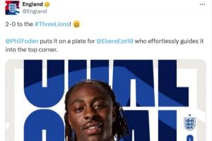 英格兰2-0击败塞尔维亚,埃泽在第90分钟破门锁定胜局,英格兰官方的进球描述却引发了一众英国球迷的吐槽。 英格兰官方在播报进球时写道:“三狮军团2-0领先!福登将球喂到嘴边,埃泽毫不费力地将球送入上角。” 众球迷吐槽: 喂到嘴边?我要疯了!埃泽打进一球,所有评论都聚焦于助攻者,这到底是什么情况? 福登到底是怎么把球喂到埃泽嘴边的?笑死了,你们看自己队的比赛了吗? 布斯克茨也是给梅西喂到嘴边的吗?