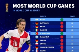 体育资讯11月15日讯 克罗地亚获得世界杯参赛资格,莫德里奇将迎来第5届世界杯,德国转会市场统计了球员在世界杯的出场次数,并列出榜单,梅西26场居首,C罗22场、莫德里奇19场。