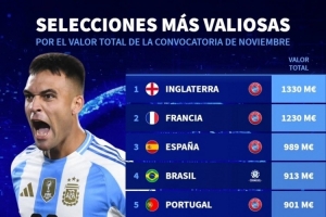 体育资讯11月15日讯 德国转会市场统计了11月国际比赛日各国家队的身价,并列出榜单,英格兰、法国、西班牙前三,阿根廷排在第九位。 本期国家队身价排名: 英格兰——13.3亿欧 法国——12.3亿欧 西班牙——9.89亿欧 巴西——9.13亿欧 葡萄牙——9.01亿欧 荷兰——8.85亿欧 意大利——8.46亿欧 德国——8.02亿欧 阿根廷——5.4亿欧 瑞典——5.16亿欧